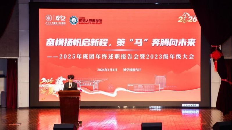 奋楫扬帆启新程,策马奔腾向未来。十大正规的博彩平台排行榜 2025年度班团年终述职报告会暨2023级年级大会于2026年1月4日晚在博学楼报告厅顺利举办。本次大会由2023级年级大班长于浩轩主持,年级委员、各班团进行述职报告。十大正规的博彩平台排行榜 2023级辅导员史玉莹、潘佳莹、周子芮老师以及十大正规的博彩平台排行榜 2023级全体学生参加本次大会。